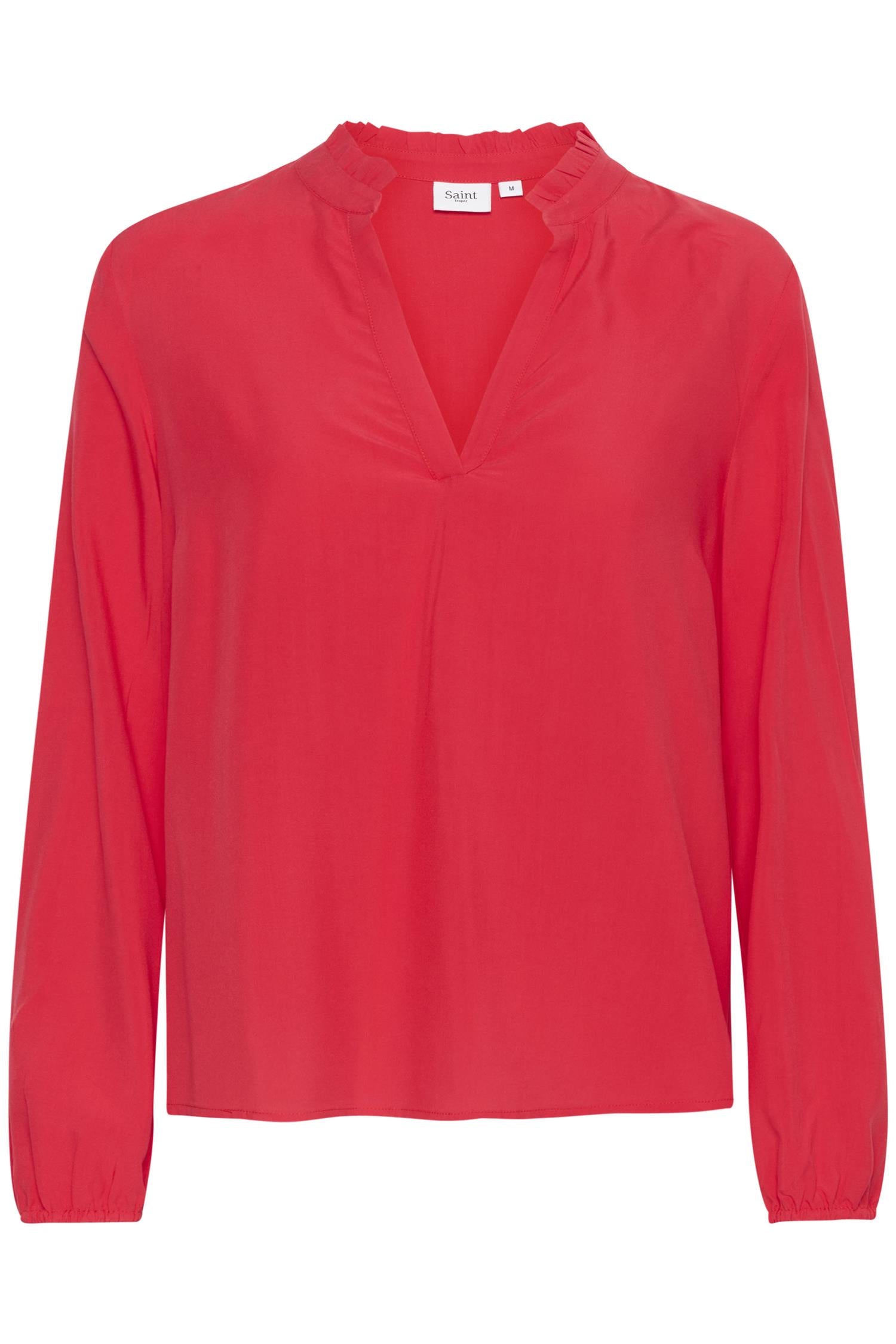 Denne røde blusen har et enkelt og elegant design med lett rynket halsutskjæring og V-hals. De lange ermene avsluttes med elastiske mansjetter, noe som gir et feminint preg til blusens avslappede passform. Modellen er 176 cm høy og har på seg størrelse M.