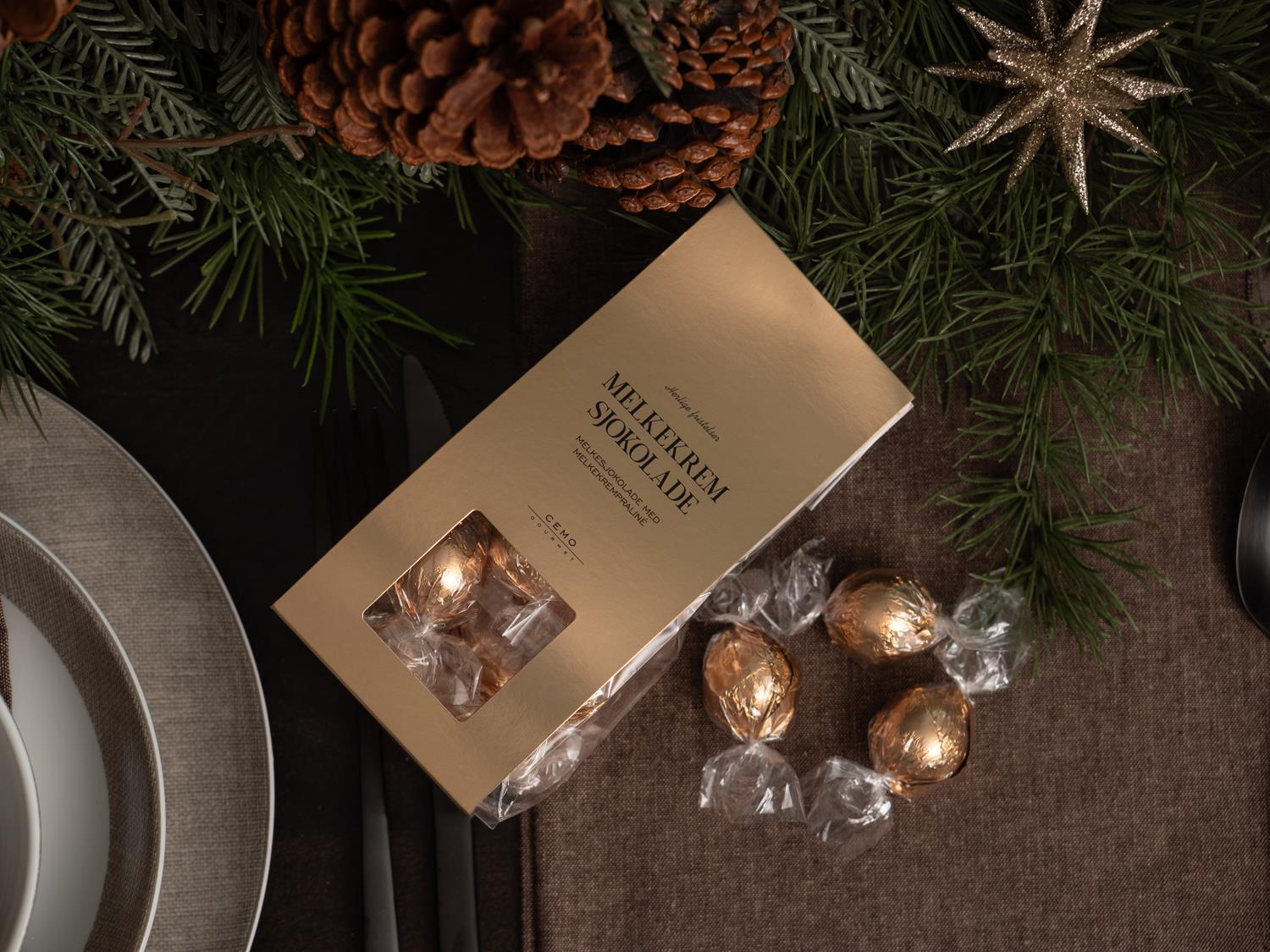 Vår melkekremsjokolade er en liten bit av juleluksus. Den fyldige sjokoladen er fylt med myk og søt melkekrem, og hver bit er pakket i skinnende gullfolie som gir et eksklusivt preg. Like god å nyte alene som den er dekorativ på julebordet. En klassiker som sprer både glede og julestemning.