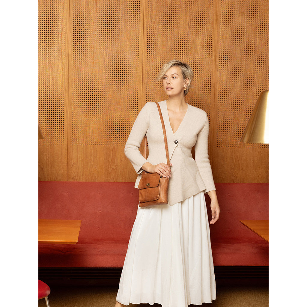 Crossbody-veske i klassisk og tidløst design. Vesken har en frontlomme med vrilås i metall. Åpning for å avsløre et hovedrom med én glidelåslomme, er denne klassiske vesken stor nok til å holde telefon, nøkler, kortholder, en liten notisbok. Stroppen er justerbar for personlig passform.