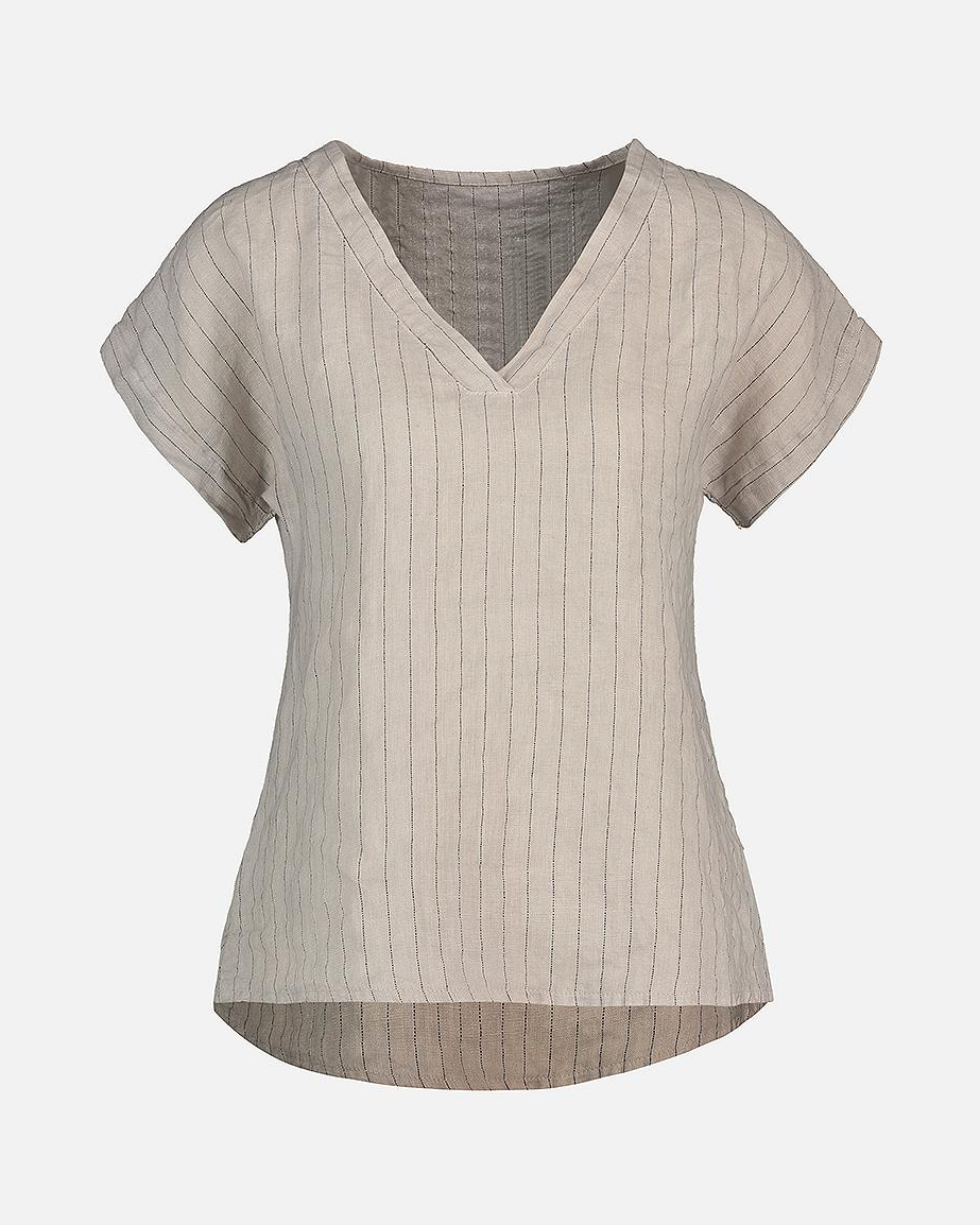 Topp i lin- og viskoseblanding. Denne har en litt teksturert overflate med grov lin-look, og stoffet er uten stretch. Den har v-hals, korte ermer og er noe lenger bak.