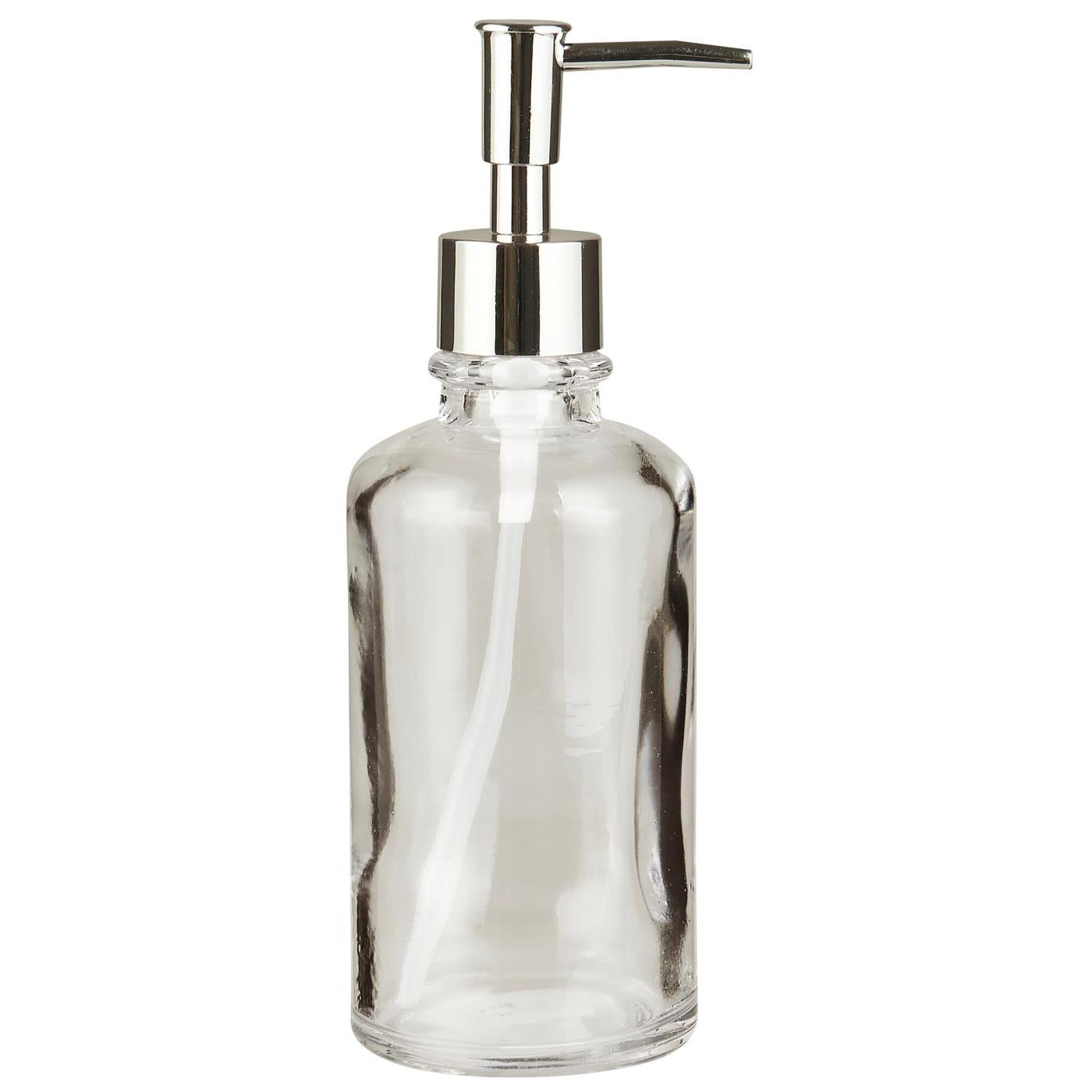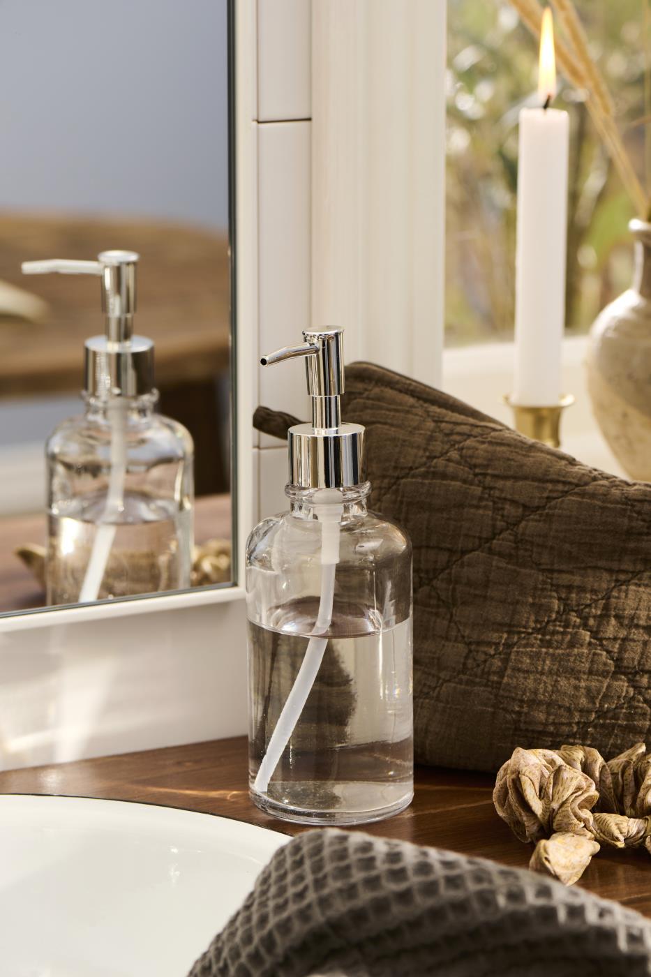 Såpedispenser i klart glass m/sølvfarvet pumpe