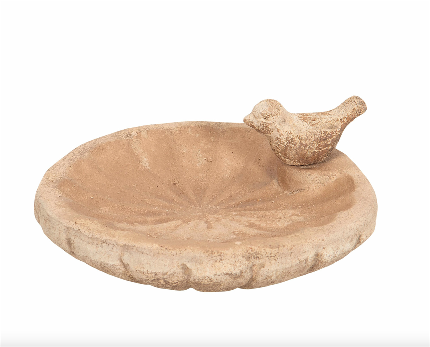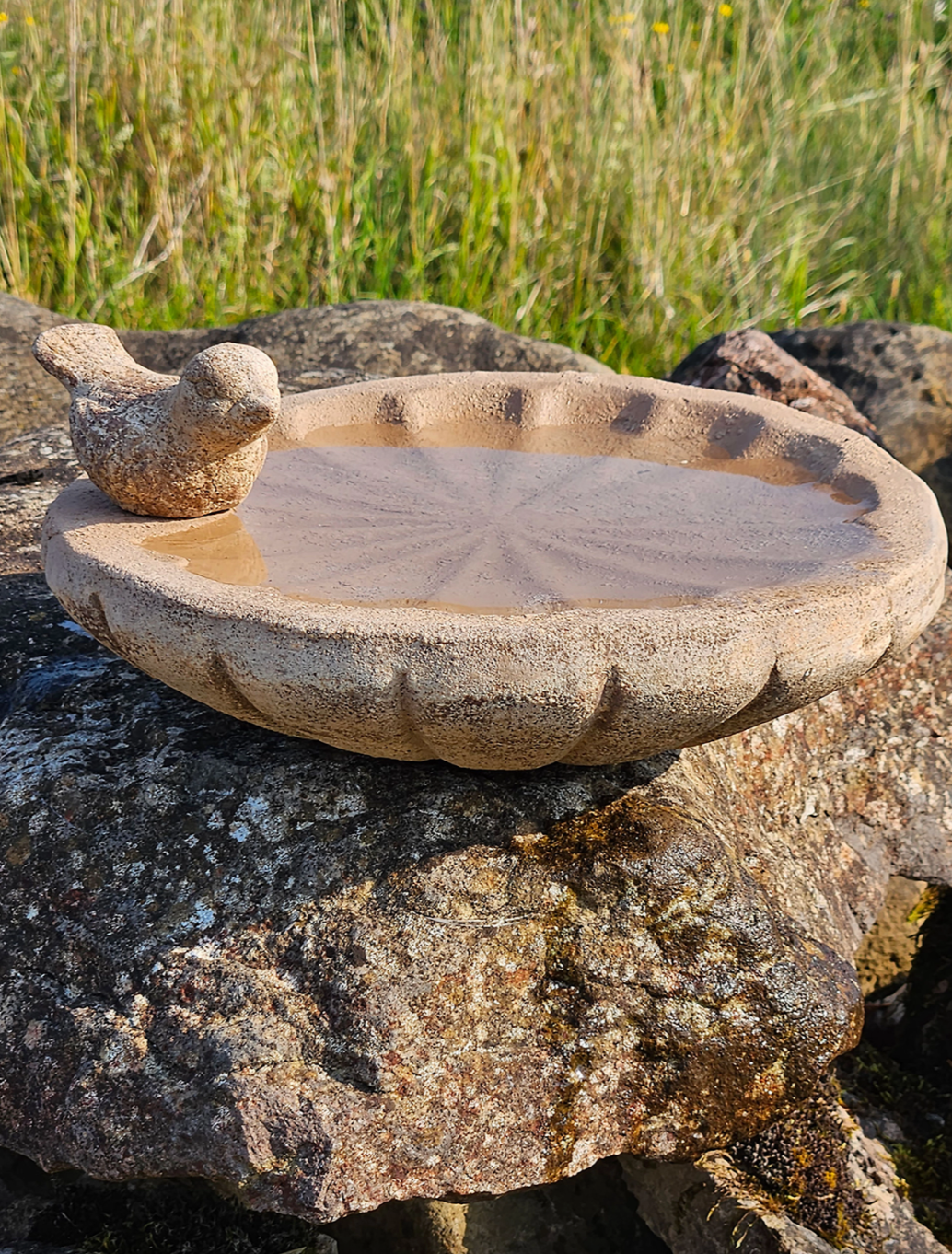 Et vakkert fuglebad med en liten fugl på kanten. Fyll med vann og la fuglene komme på besøk i hagen din. Laget av steingods.
