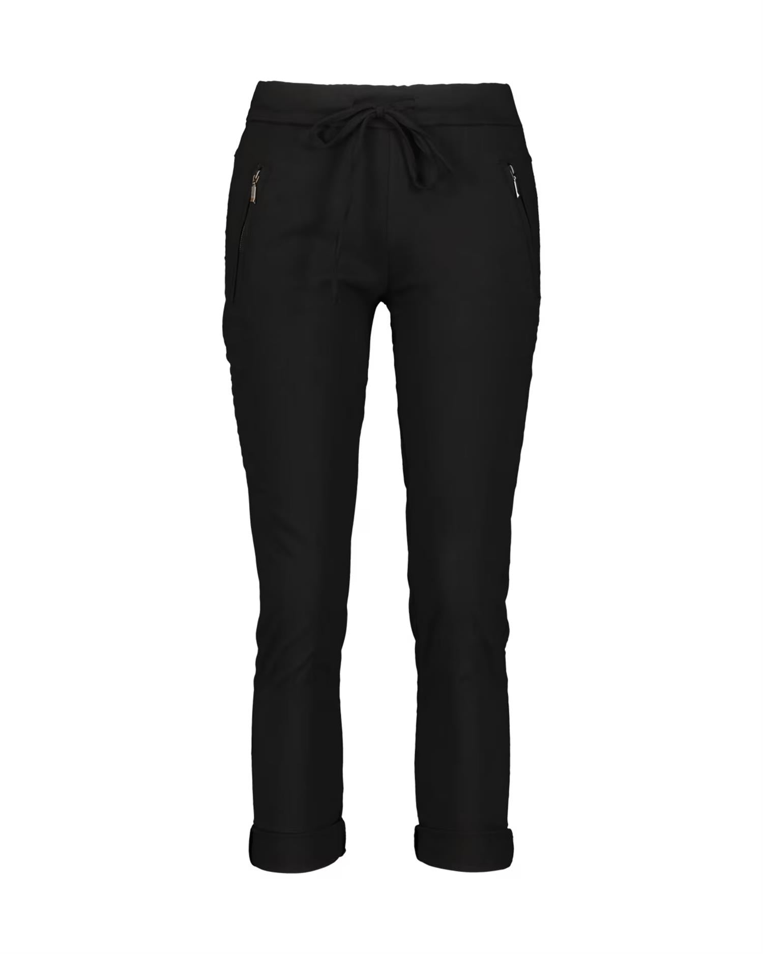 Myk bukse/Capri med en smal passform og veldig god stretch. Den har mellomhøyt liv med strikk og knyting. Glidelåslommer foran. Brettet kant nederst som ikke er sydd fast. Buksen har en croppet lengde.