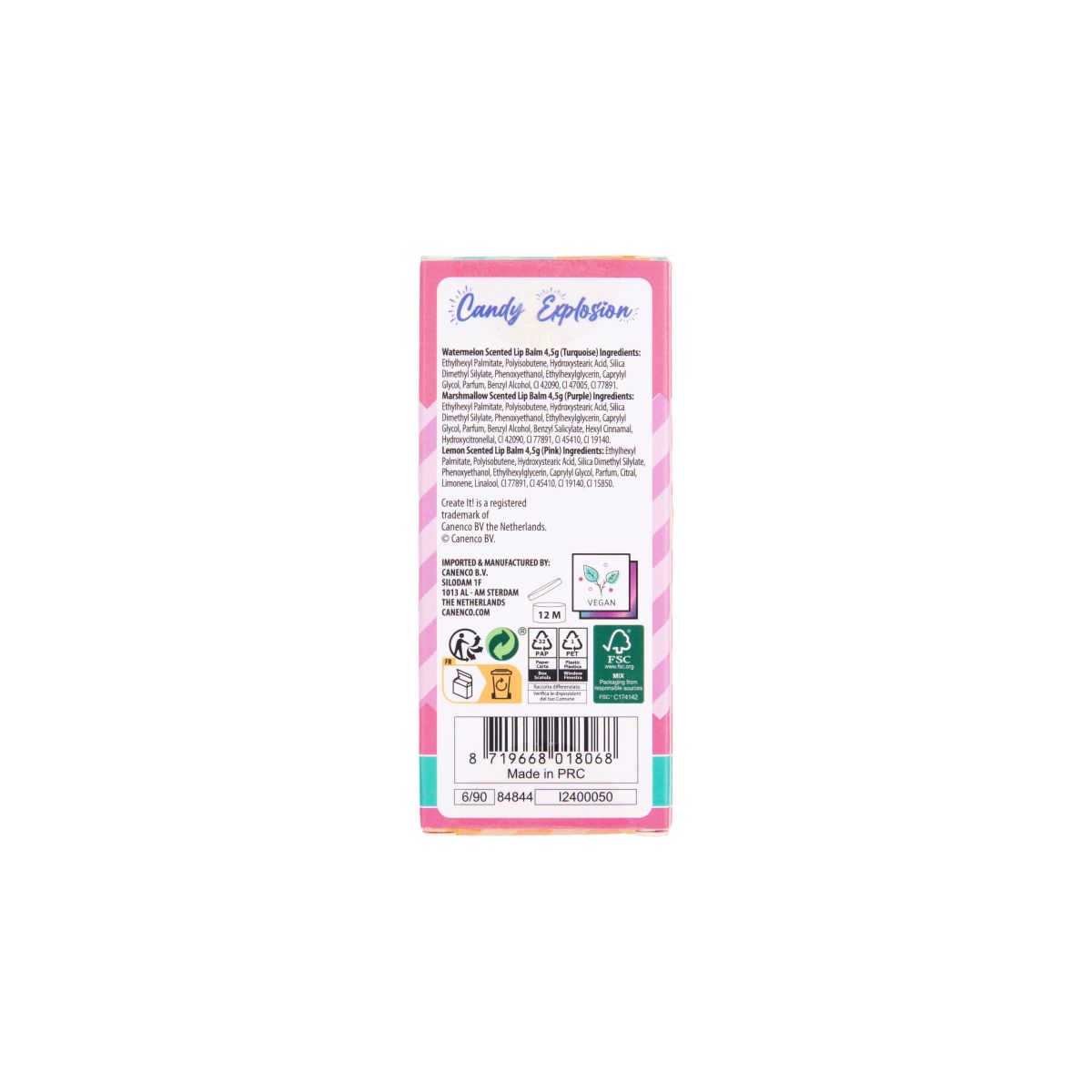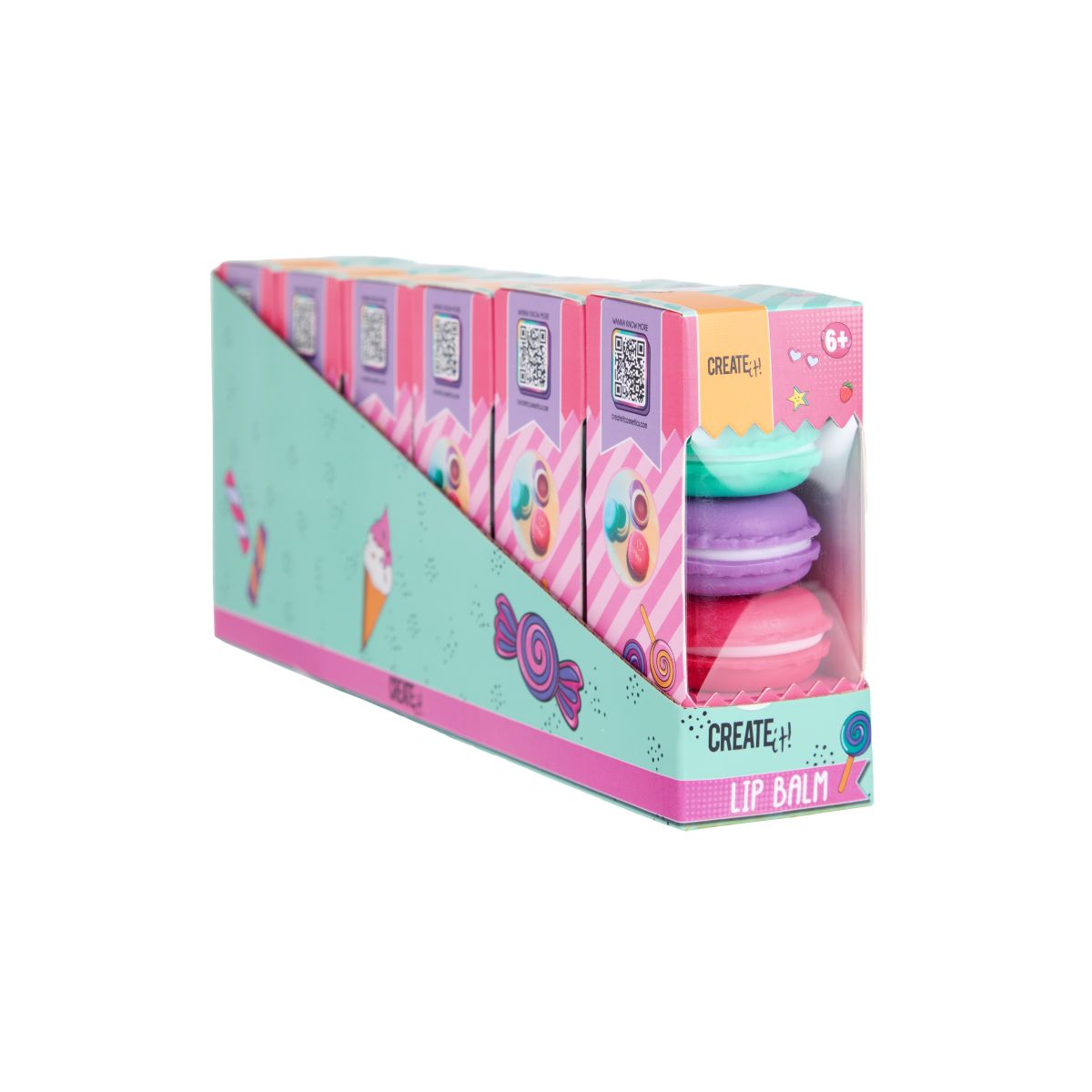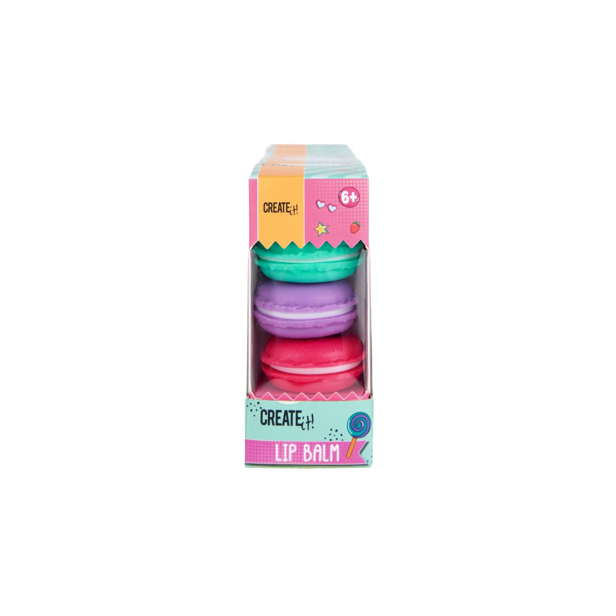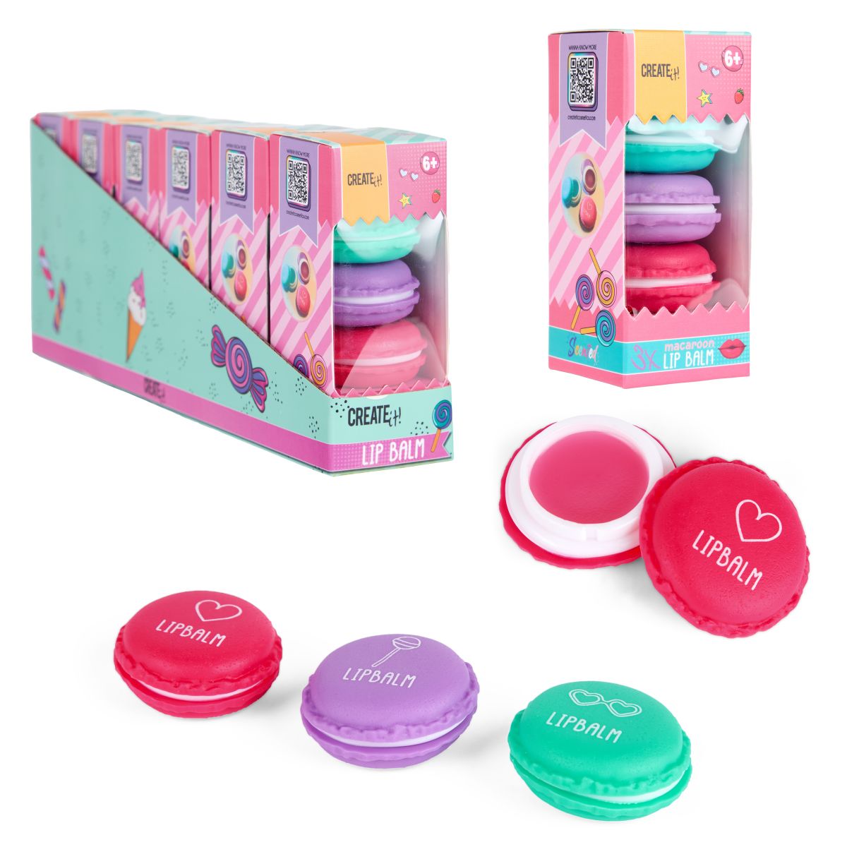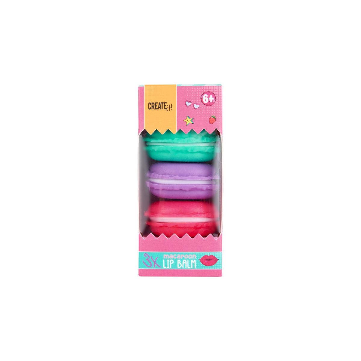 Create it! Lip balm-sett med 3 søte makroner i duftene vannmelon, marshmallow og sitron. Hver leppepomade inneholder 4,5 gram og gir myke og velduftende lepper. Perfekt for barn fra 6 år og oppover.