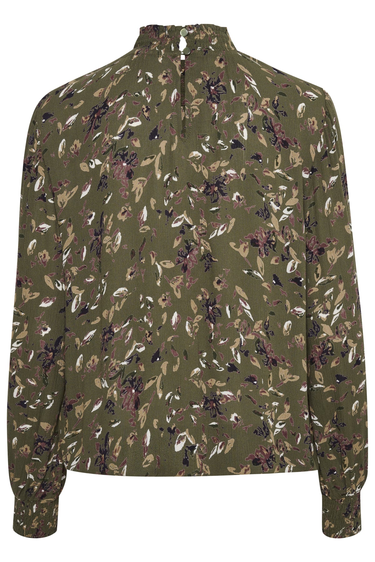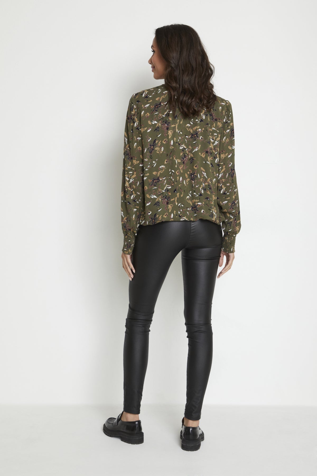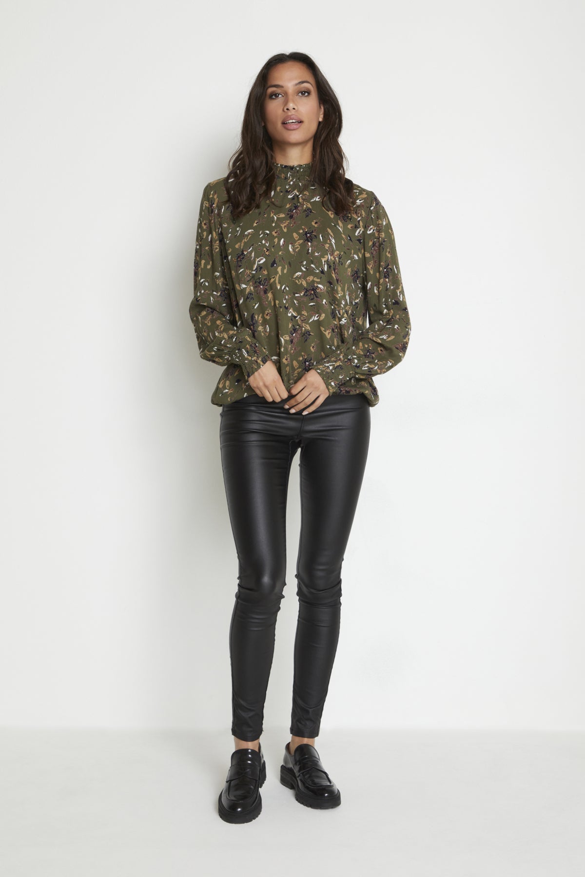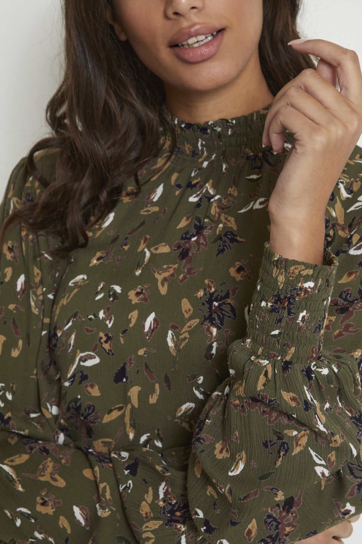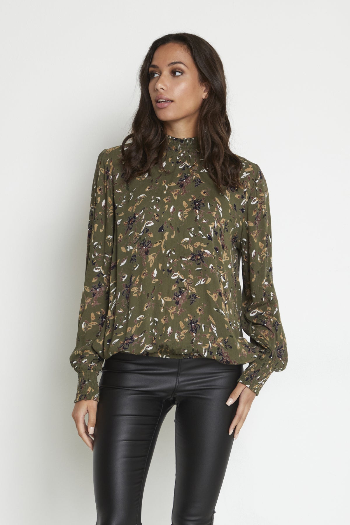 Nydelig bluse fra Kaffe med lange ermer, tettsittende smockmansjetter og høy hals med knappelukking i halsen.
