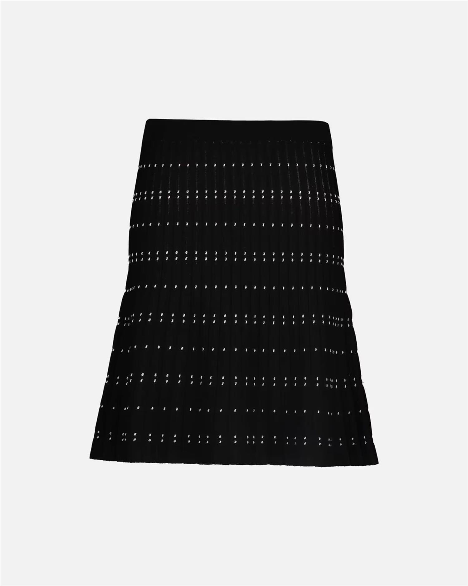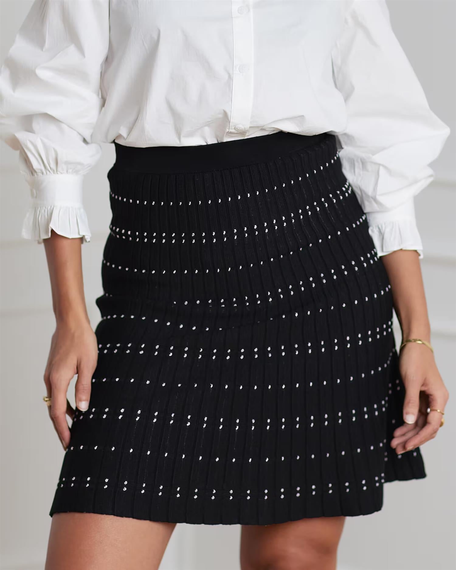 Svart skjørt i myk og stretchy kvalitet. Dette skjørtet har en kort lengde og har hvite sømdetaljer som gir det et unikt preg. Den brede strikken i livet gir god komfort og gjør skjørtet enkelt å ta på og av.
