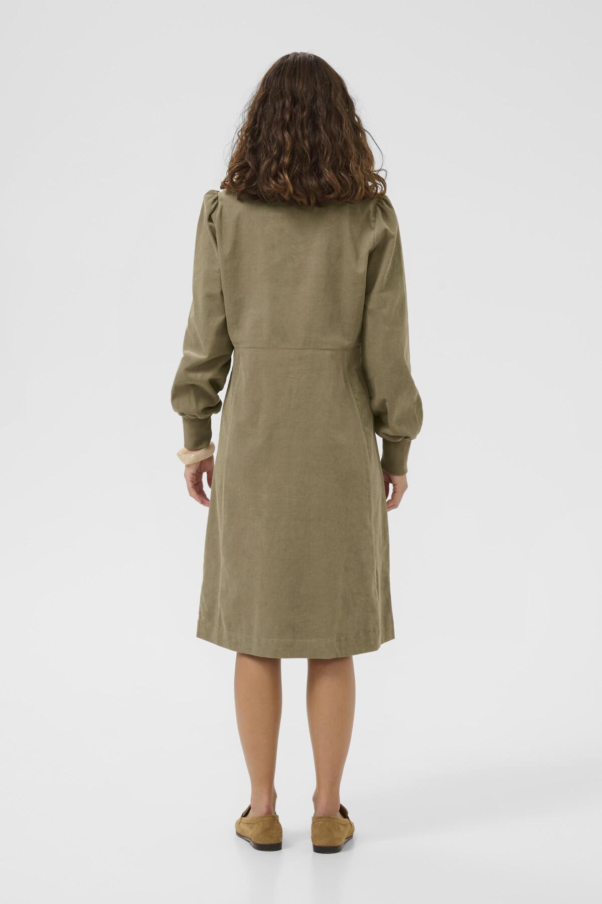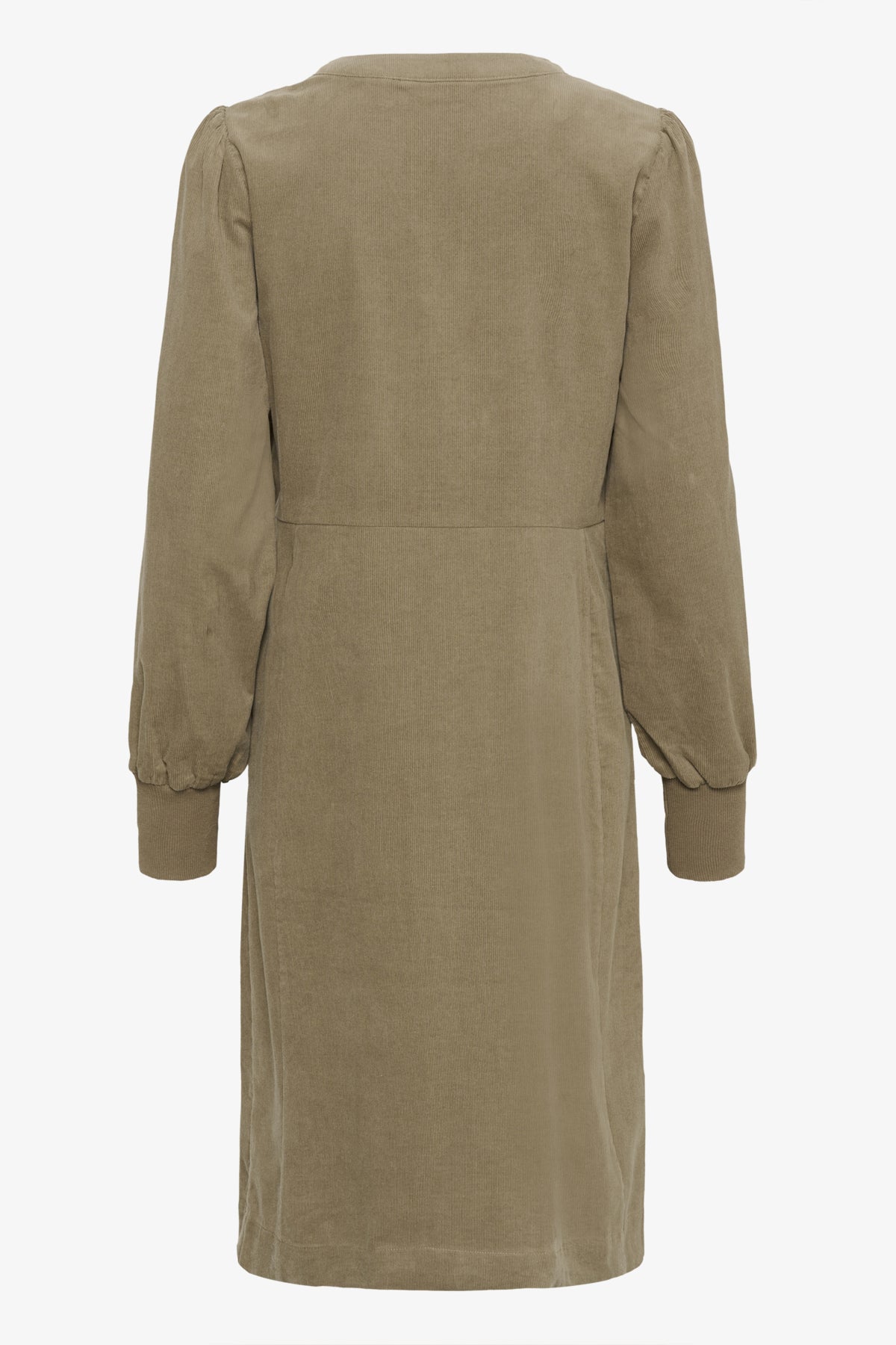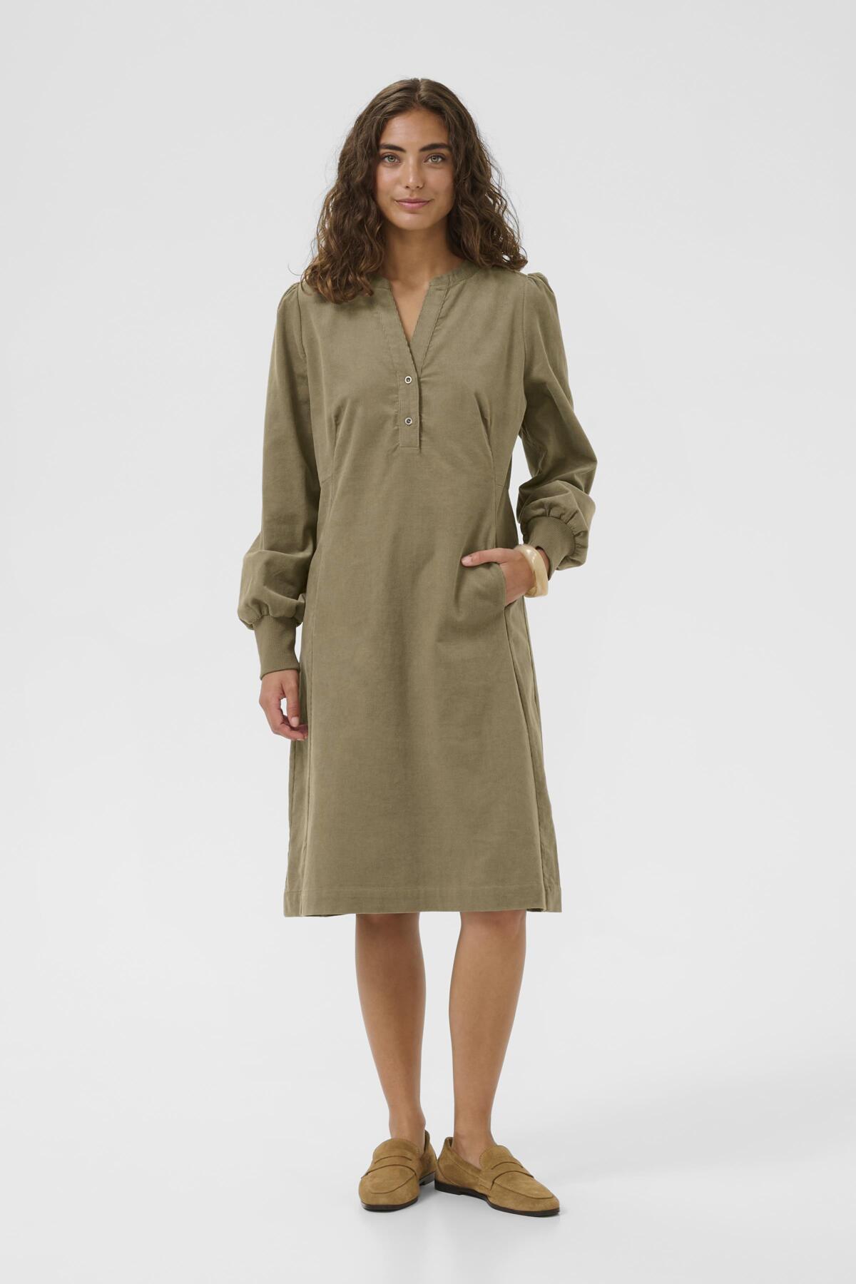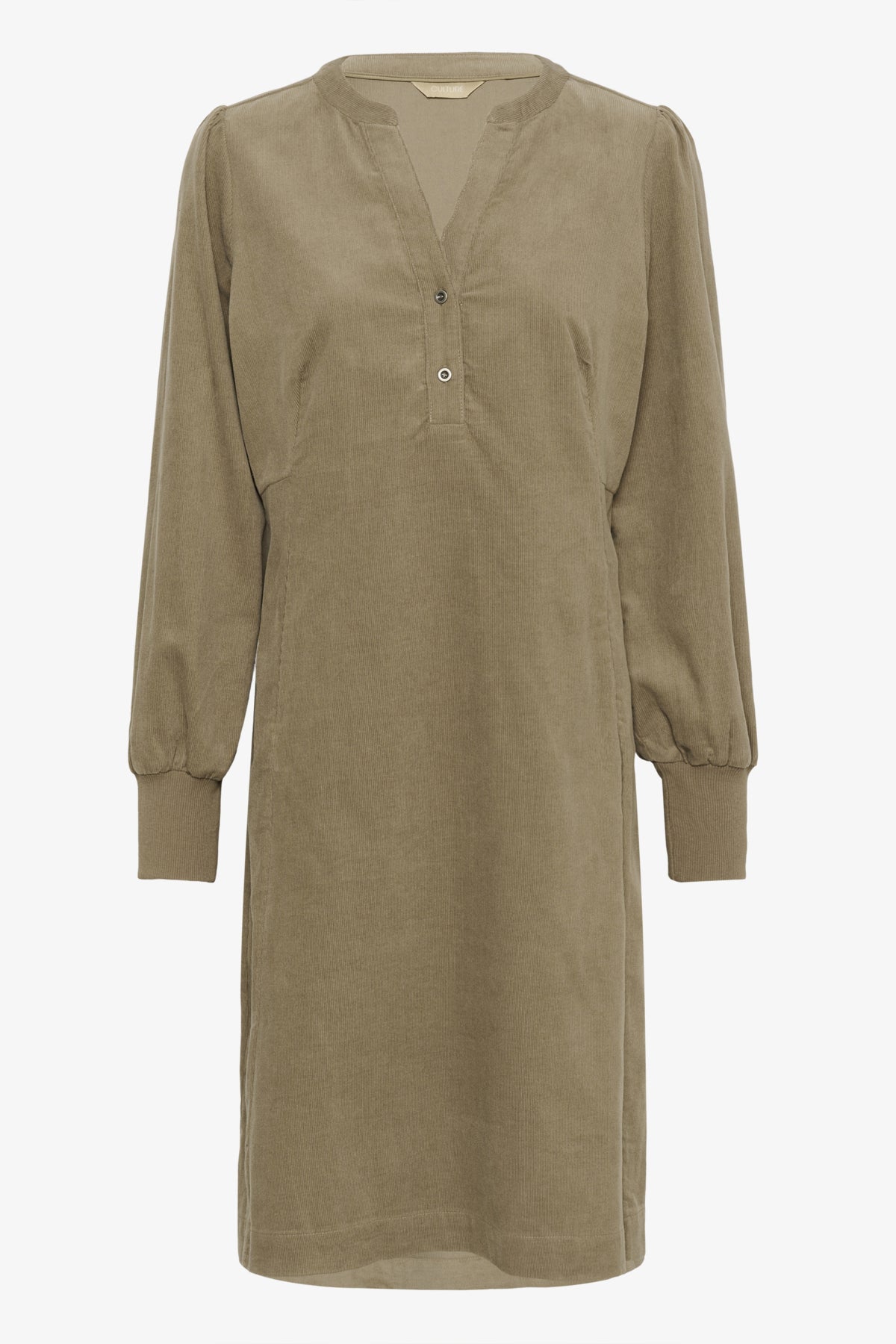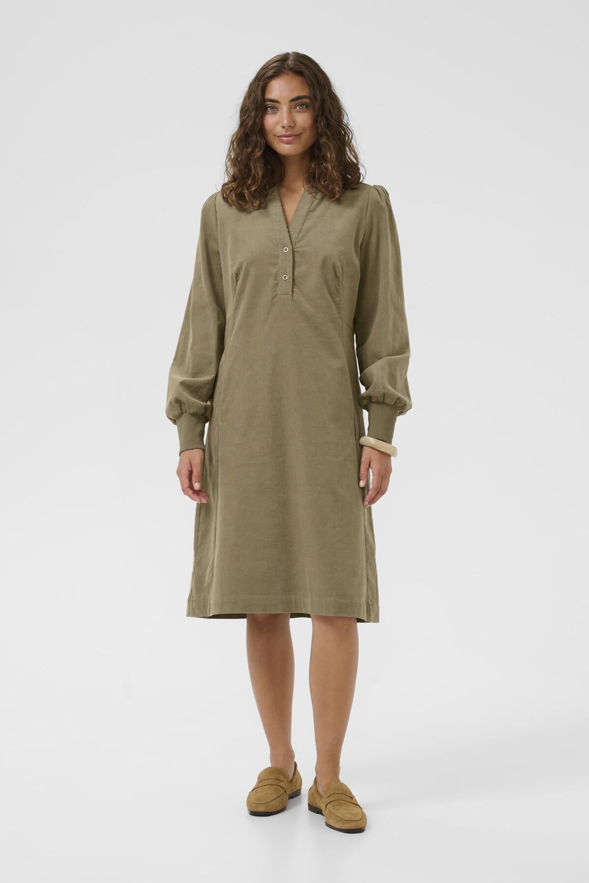 A-linjekjole for dame med avslappet passform, V-hals med knappelukking, lange ermer og knelang lengde. Gir komfort og er anvendelig til både hverdag og jobb.