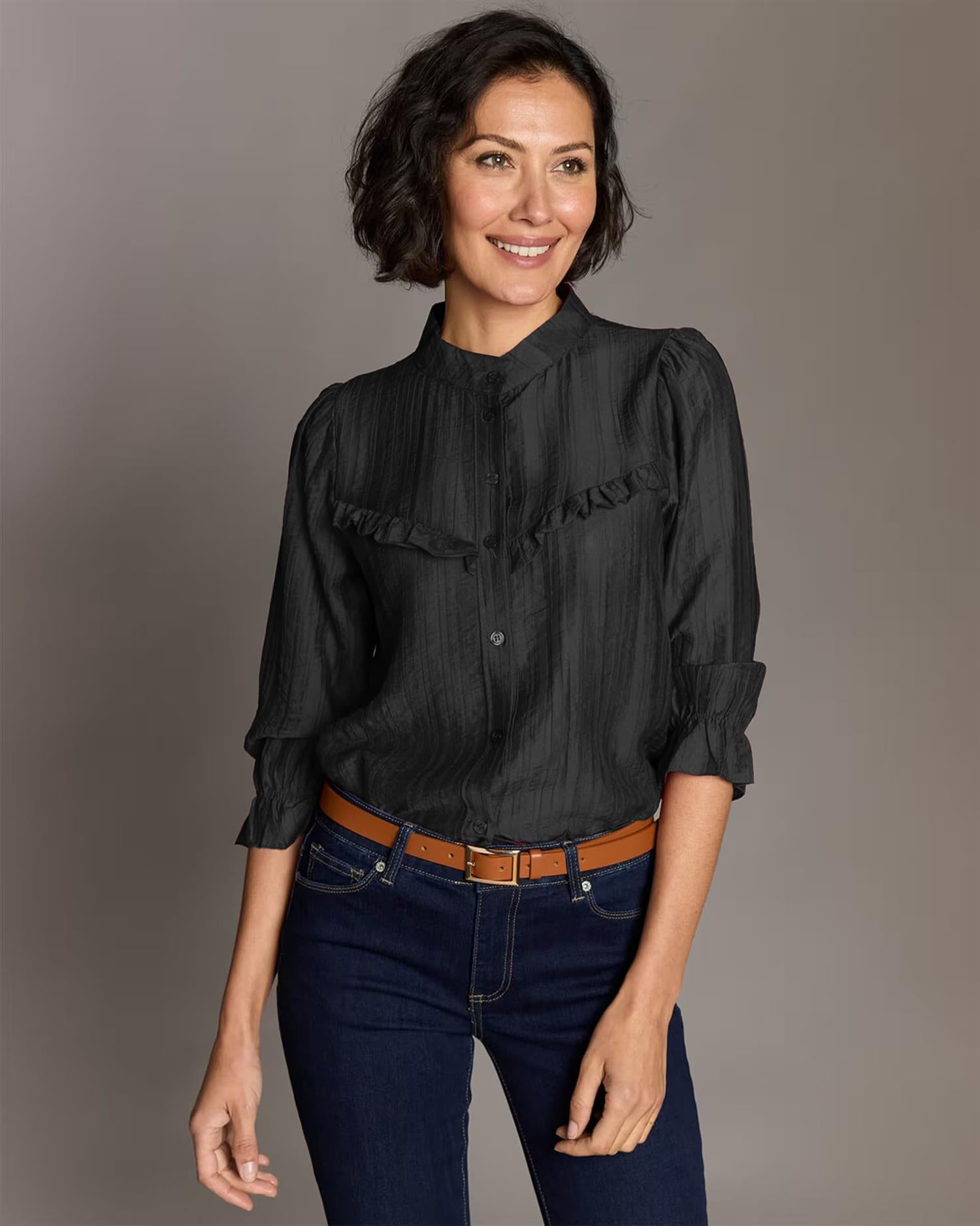 Elegant og feminin topp i en vakker sort versjon. Den er laget i en lett viskoseblanding som gir et delikat fall og en luftig følelse. Rysjedetaljer over brystet. Halvlange ermer med små legg på skuldrene og tynn strikk med volangkant ytterst.