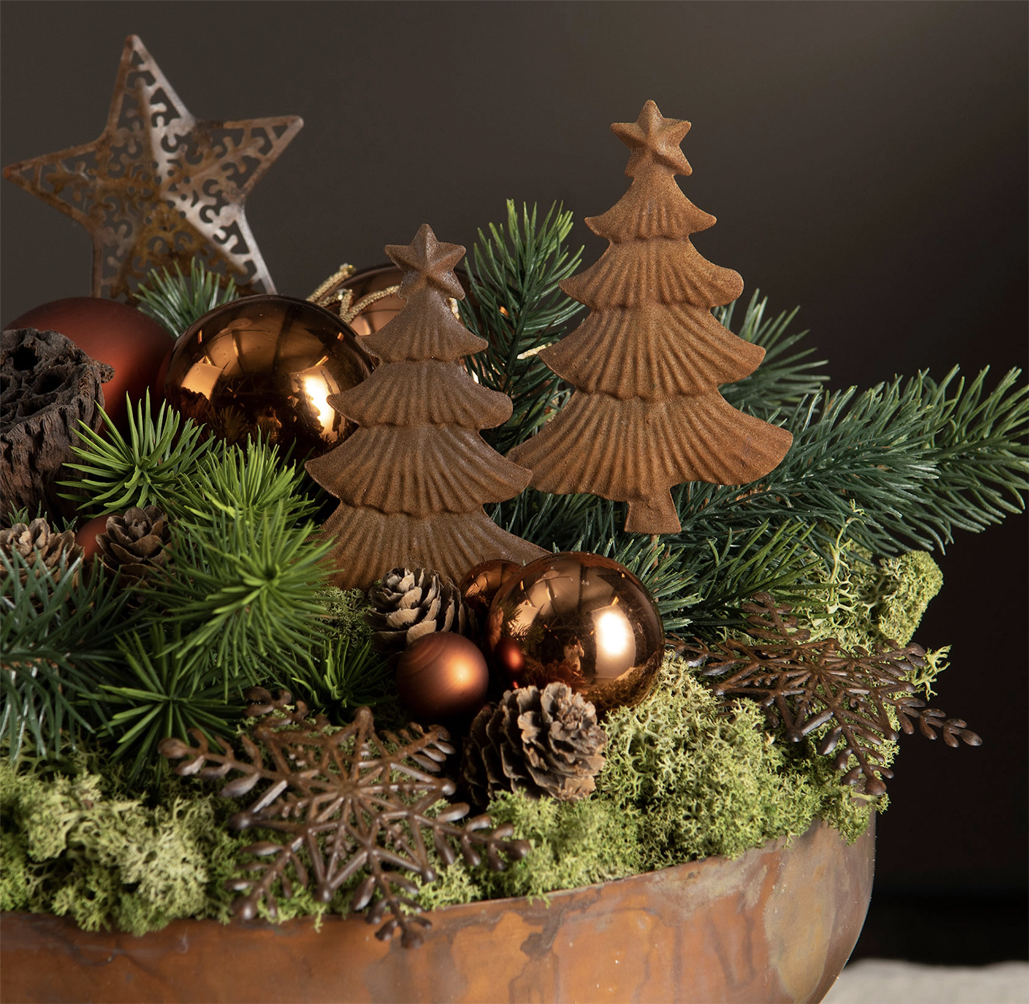 Lag et fint blomsterarrangement med julestemning og sett inn en pinne med et grantre. Laget av metall.