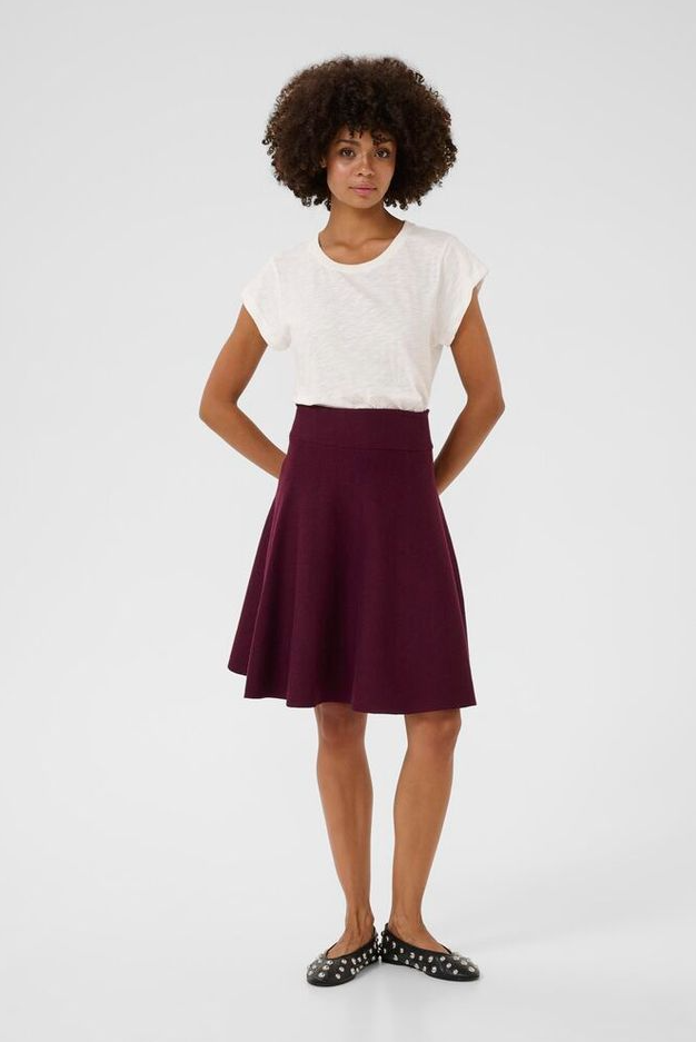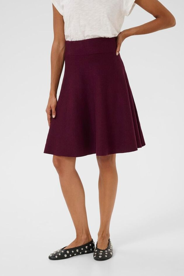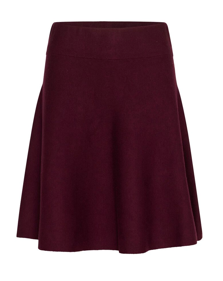 Elegant knelang strikket skjørt i vinrød, perfekt for både jobb og fritid.