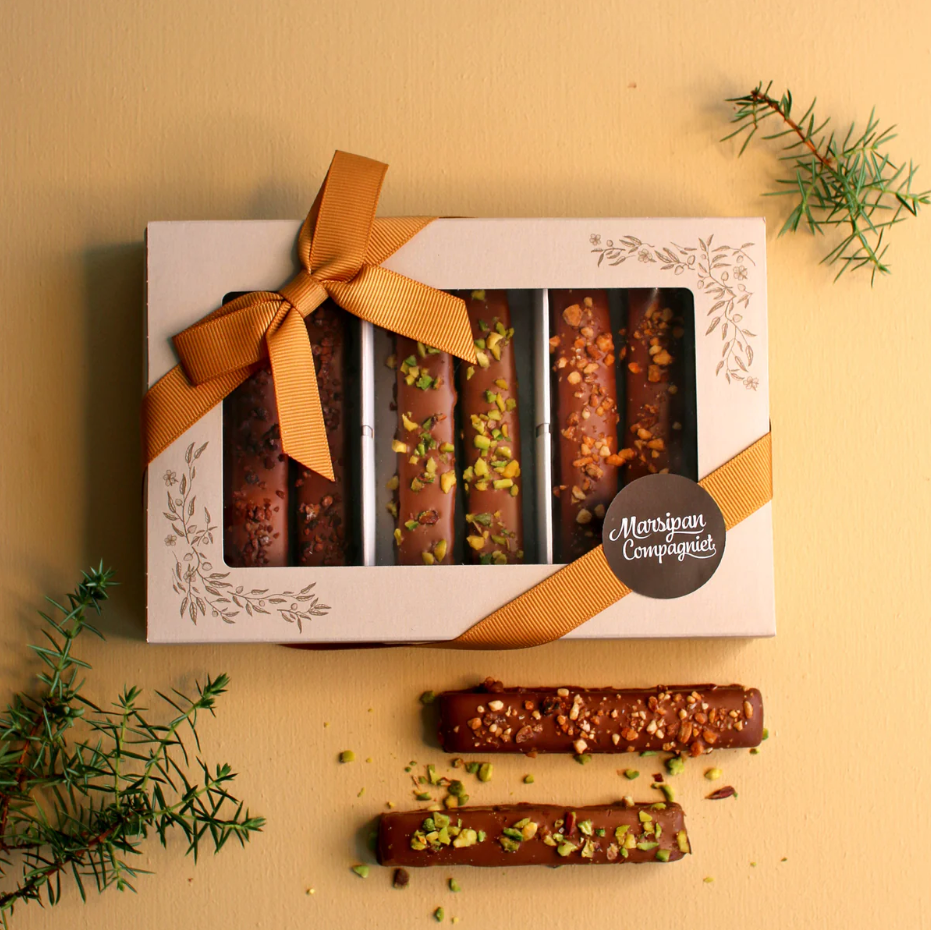 Vi har laget en eksklusiv konfekteske fylt med marsipan- og sjokolade cigarer. Håndlaget av ekte marsipan med masse mandler, nougat, pistasj, capuccino og nougatsmak dyppet i eksklusiv sjokolade.