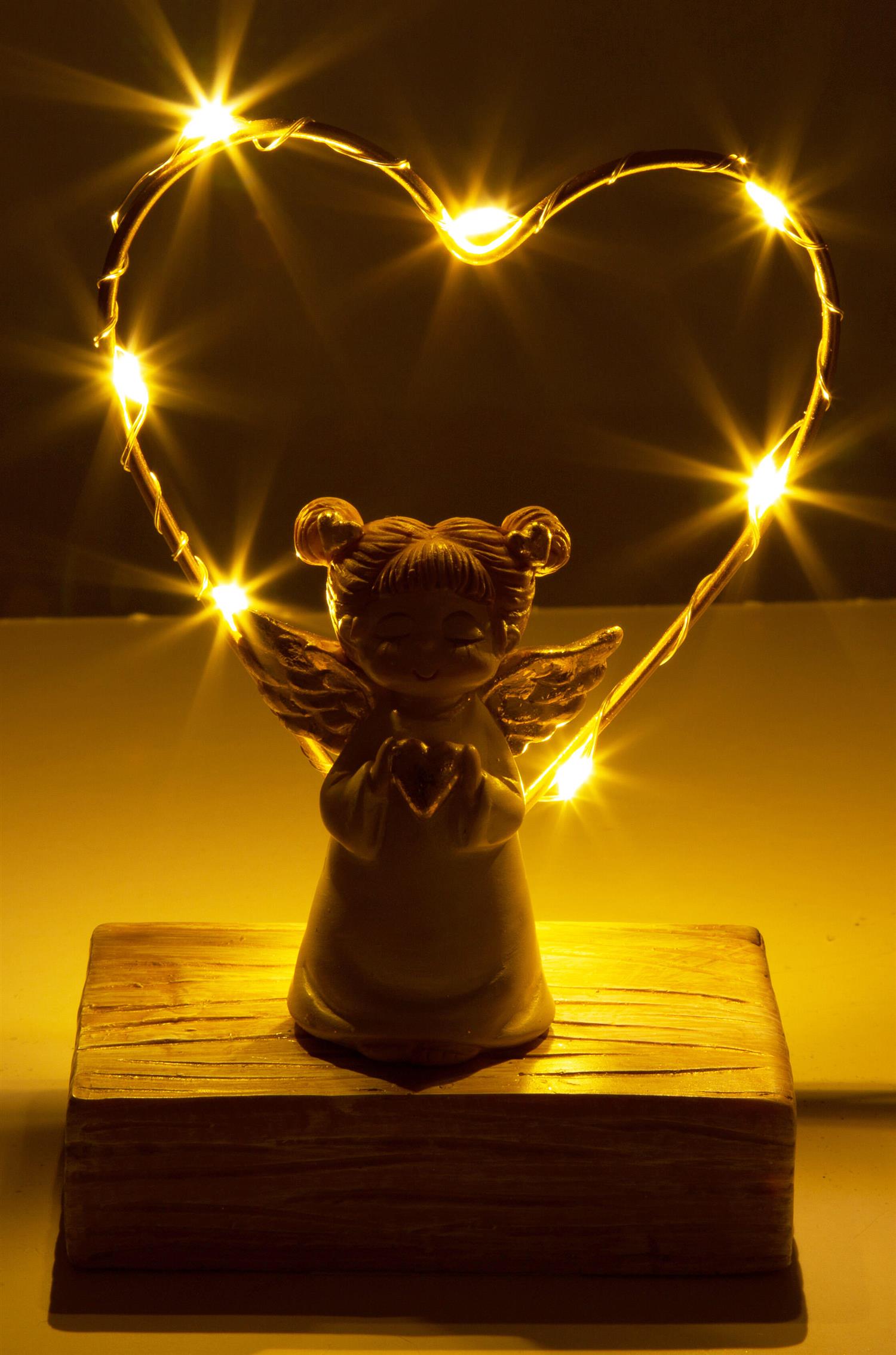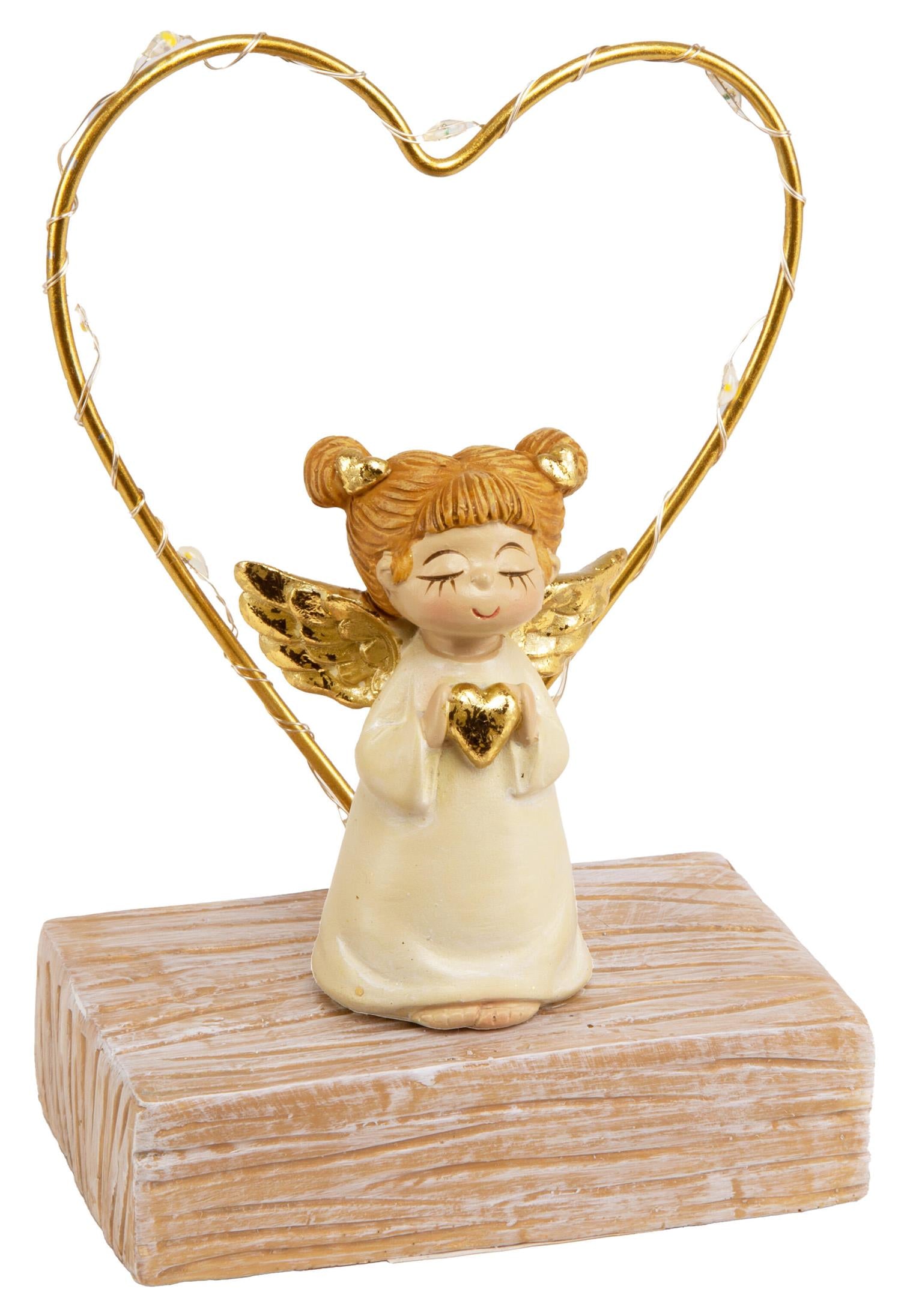 Engel på fot beige/gull LED hjerte 13cm Batteri: 2xAAA