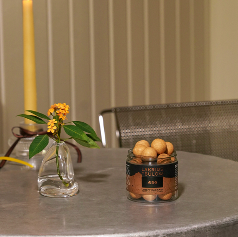 Silkemyk dulce-sjokolade møter rålakrispulver og en kjerne av søt lakris, omsluttet av et vakkert lysebrunt sukkerskall. Små flak av havsalt gir prikken over i-en og løfter den kremete, sprø opplevelsen.