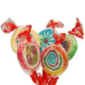 Sukker, glukosesirup, sitronsyre, vegetabilsk palmefett, aroma (frukt), Fargestoffer: E100, E120, E132, E133, E141, E153.